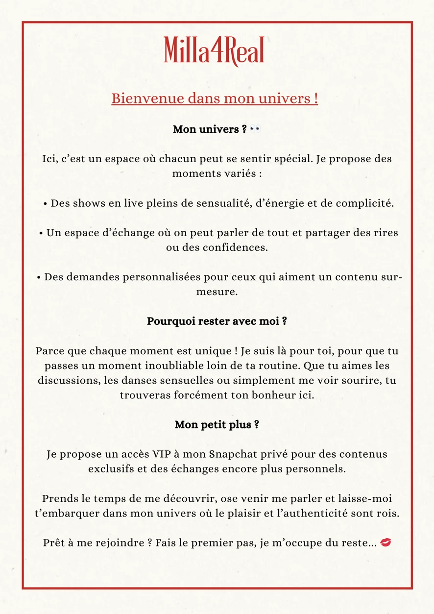 POLITIQUE DE CONFIDENTIALITE : Toute utilisation non autorisée de mon profil, vidéos , images ou audio, sous quelque forme que ce soit ou dans un forum, maintenant ou dans l’avenir n’est pas autorisée sans mon consentement écrit. L’utilisation de mon profil, vidéos, images, ou audio sous quelque forme que ce soit de mon profil est une atteinte de ma vie privée et de mon image, elle est passible de poursuites judiciaires allant jusqu’à un an d’emprisonnement et 45 000 euros d’amende. Article 226-1 du Code pénal.